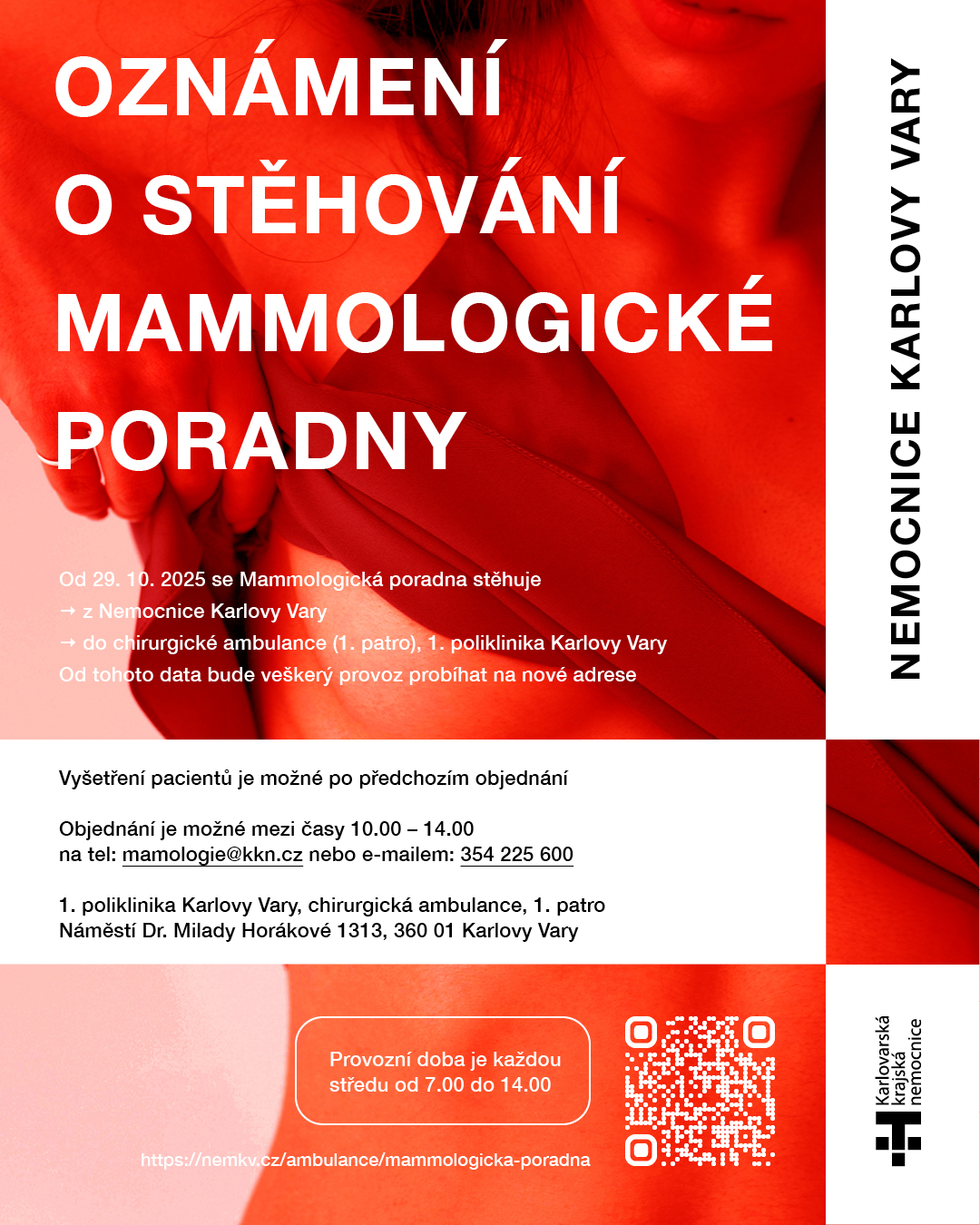 Od 29. října 2025 najdete mammologickou poradnu Nemocnice Karlovy Vary na nové adrese, a to na 1. poliklinice Karlovy Vary na náměstí Dr. Horákové v prostorách chirurgické ambulance.
